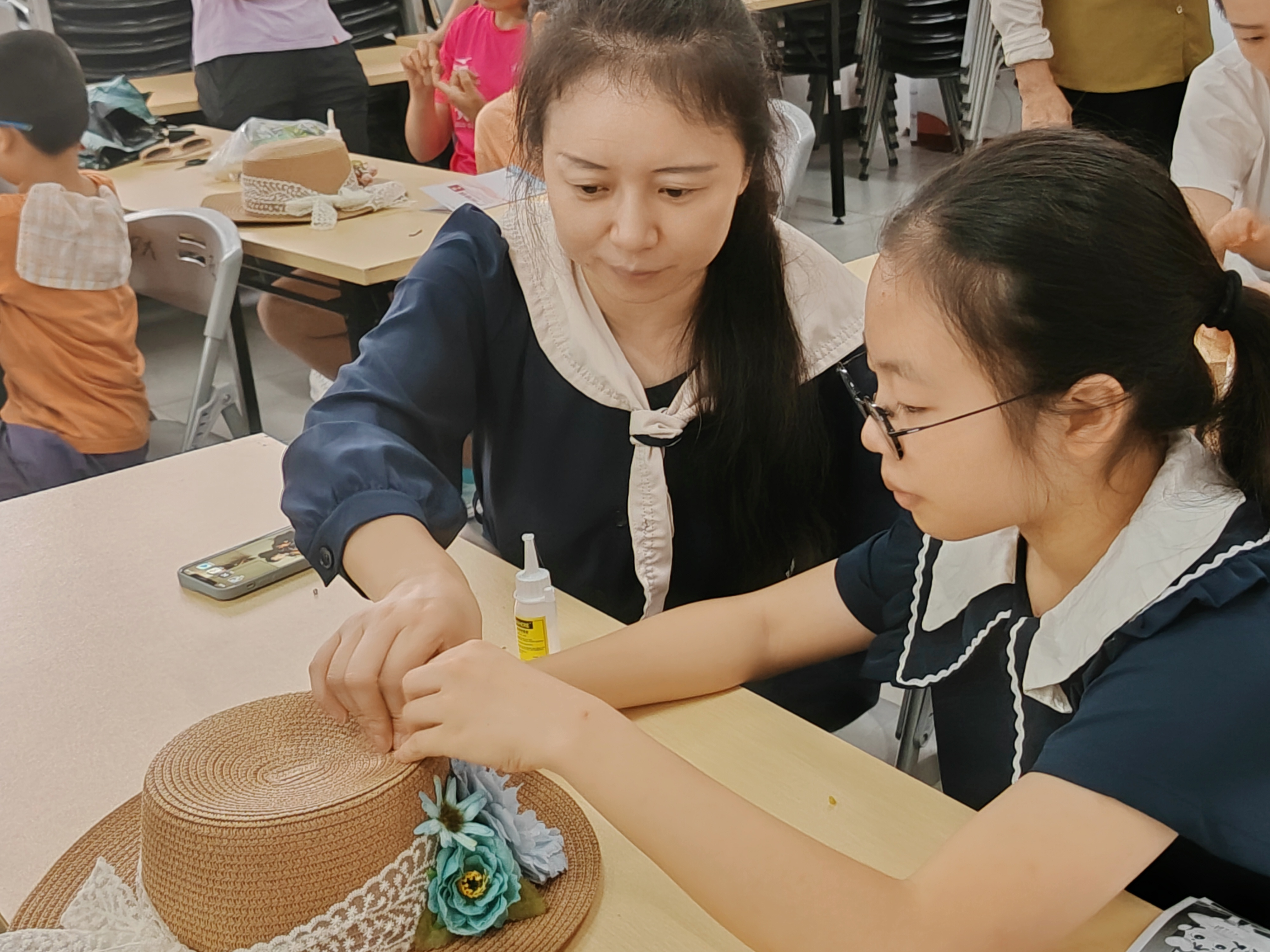 安全讲座结束后,亲子家庭迎来充满创意的花艺草帽DIY环节。在专业老师的悉心指导下,家长与孩子充分释放想象力与创造力,携手装点草帽。色彩绚丽的干花、精巧别致的丝带等装饰材料,在亲子协作下幻化成一个个独特造型。孩子们精心挑选心仪材料,小心翼翼地粘贴装饰;家长们则在一旁耐心辅助、适时建议。亲子间默契配合,欢声笑语不断。片刻功夫,一顶顶独具匠心、“帽”美如花的草帽新鲜亮相,孩子们戴上亲手制作的草帽,脸上绽放出自豪与喜悦的笑容。